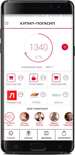 Позволяет более эффективно использовать свои средства: участник Программы может накопить необходимую сумму на погашение кредита. А накопить недостающую сумму помогают друзья Участника, так как накопленные бонусы можно отправлять человеку из личных контактов.